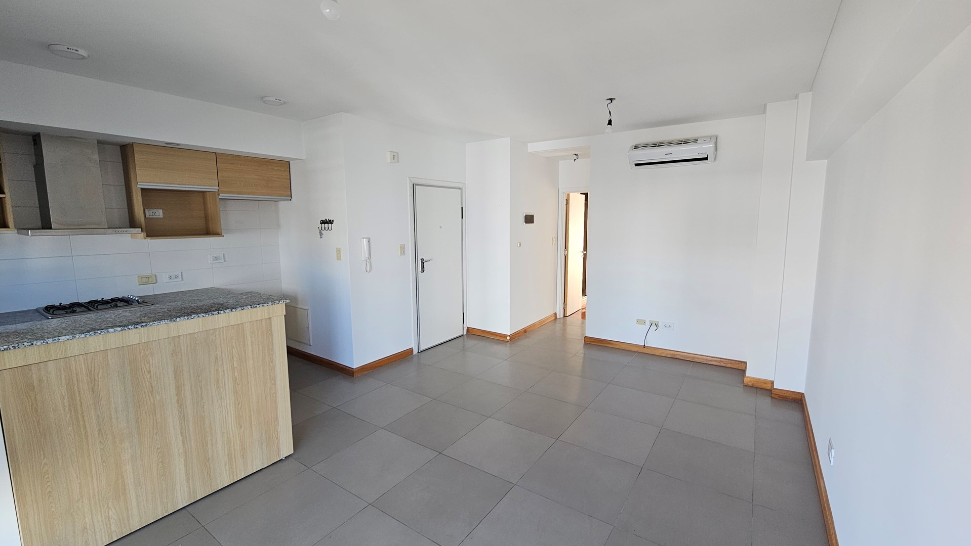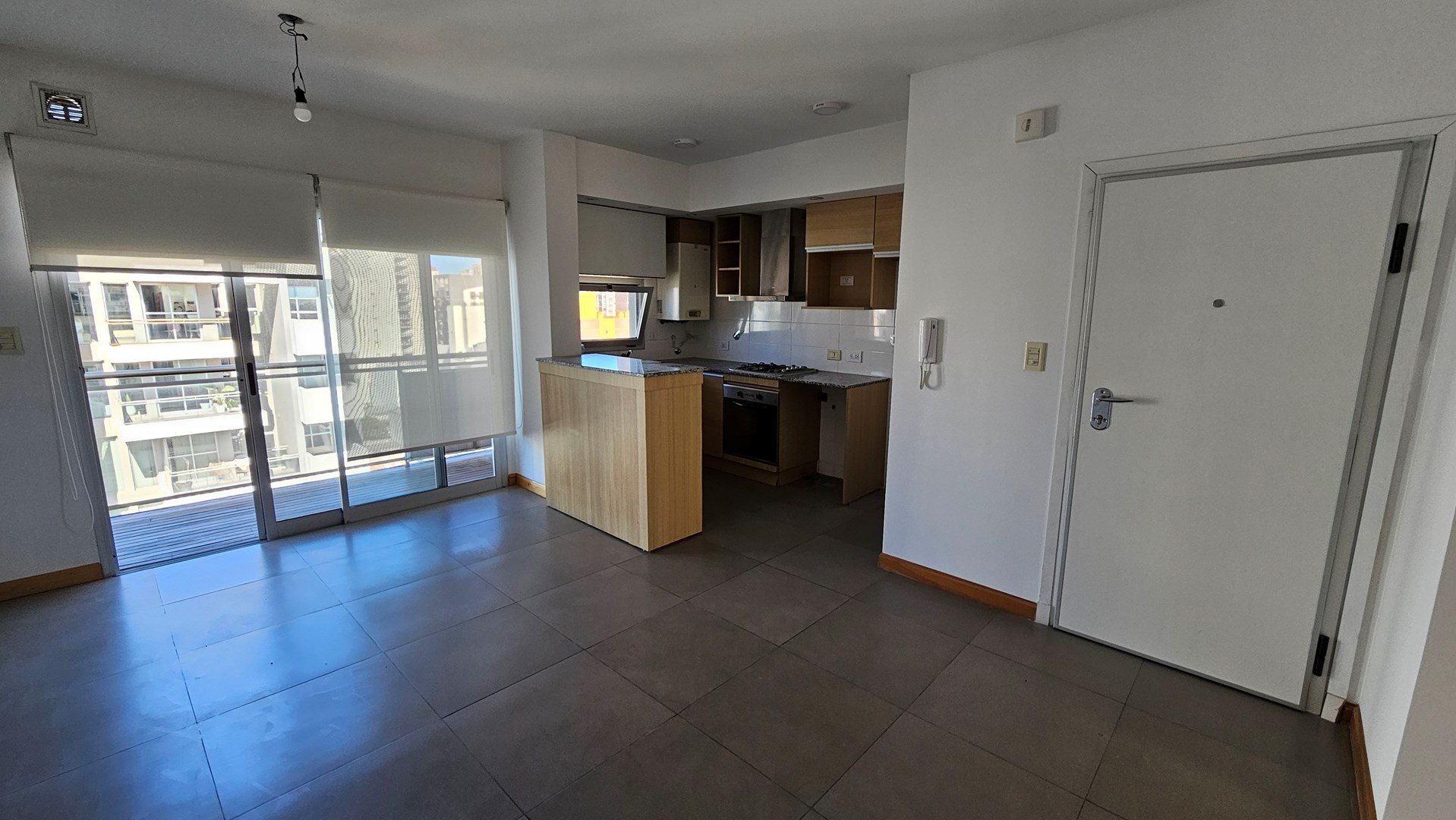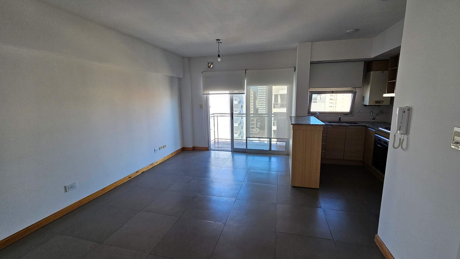 Living-Comedor con piso porcelanatto y cocina integrada, balcon al frente, baño completo, 1 dormitorio con placard y balcon al contrafrente.